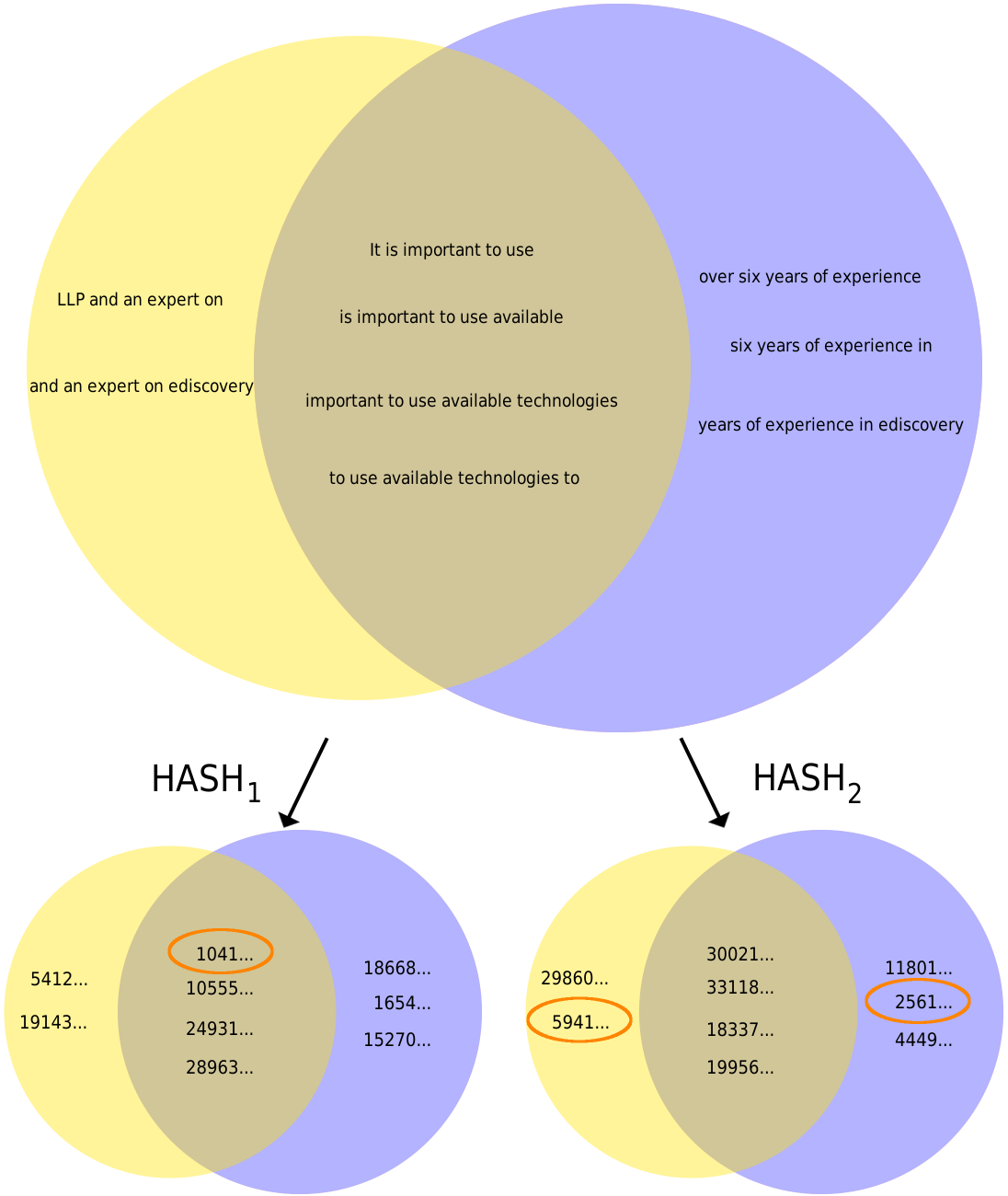 Each document from Example 1 is represented by a circle. Shingles shown in the intersection are common to both documents. Only a subset of shingles are shown due to space constraints. Result of two hash functions being applied to shingles is shown with last 34 digits dropped. Minimum hash value for each document is circled in orange. The first hash function selects a shingle common to both documents. The second selects a shingle that exists only in the right document (minimum hash values for the docs don’t match).